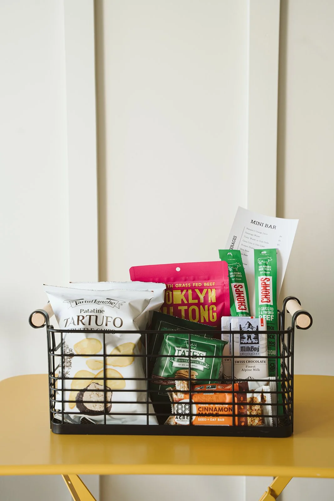 MINI BAR TRAYS WITH LOCAL SNACKS, SPIRITS, BEER + WINE