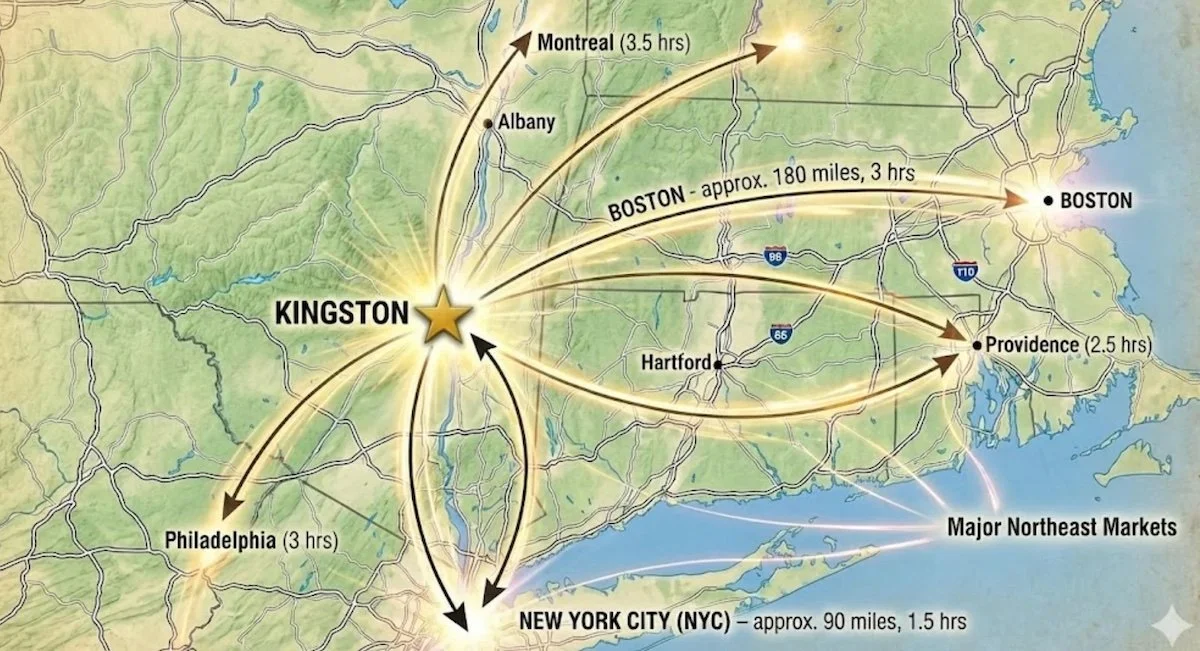 No one wants to drive more than two hours from Manhattan if they can help it. Nestled along the Hudson River in Kingston, Hutton Brickyards is 90 minutes north of New York City and near Woodstock, New Paltz, Poughkeepsie, and within easy reach of Philadelphia, Providence, and parts of Connecticut and Massachusetts.