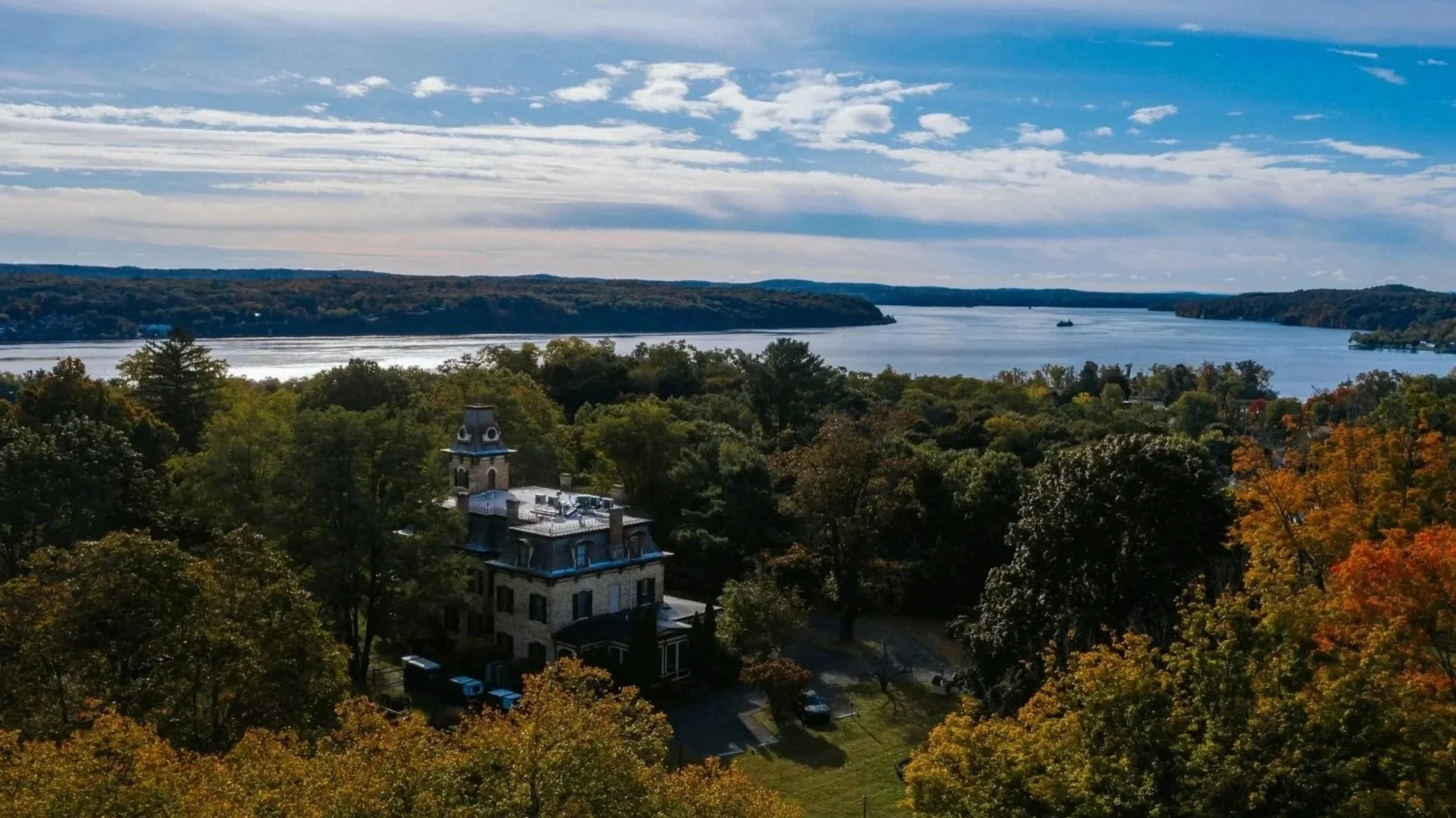 A historic mansion at the top of a hill