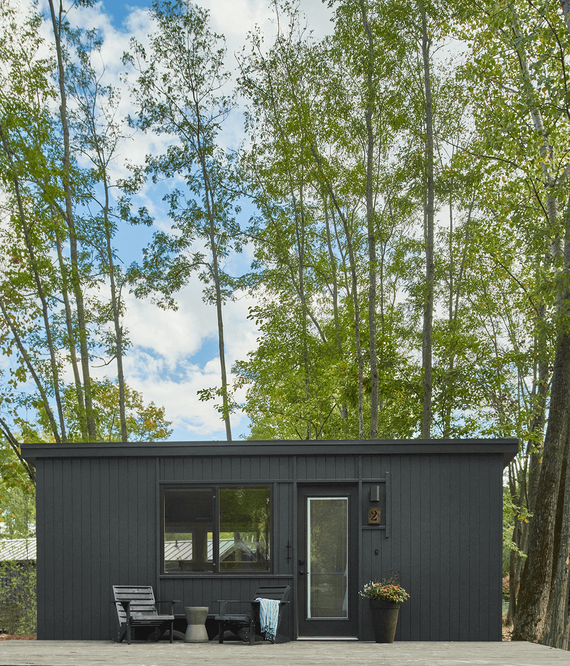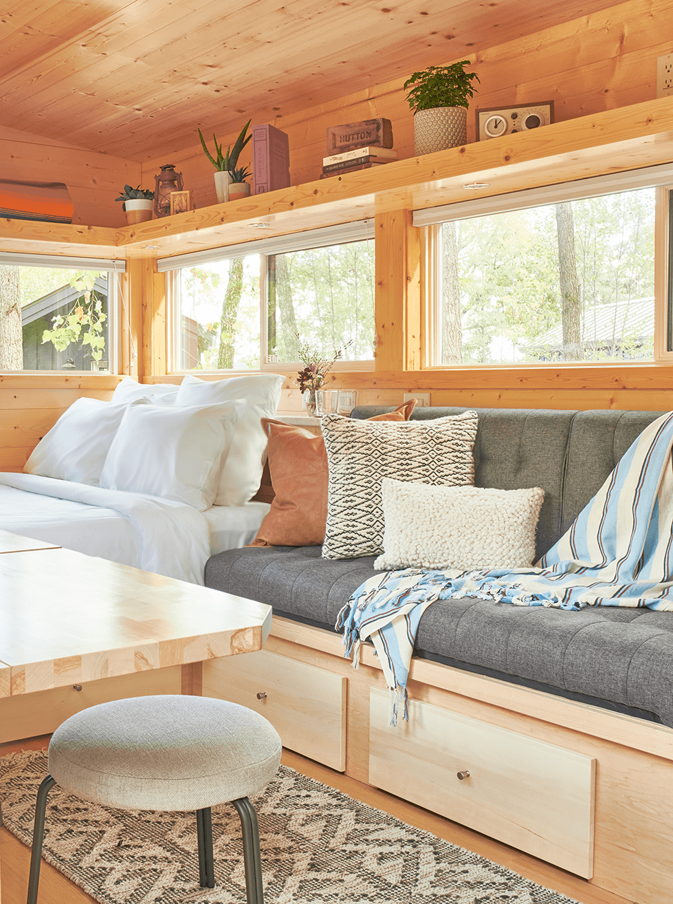 To truly experience Hutton Brickyards is to be surrounded by nature. Our Forest Queen Cabins offer the features and amenities of our Deluxe Queen Cabins, at a more intimate scale. Custom pine interiors are designed for convenience and comfort, with intuitive spaces to stow belongings and luxury linens for restful sleep. Each compact bathroom sports a generous shower. With an outdoor deck for watching the stars and a cozy interior for resting and recharging, these cabins whisper to guests who desire wooded privacy.